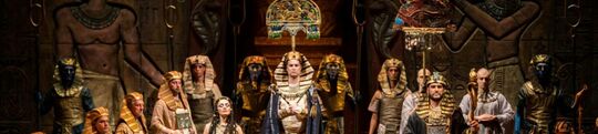 Monumental temple sets, opulent costumes, and large-scale mass scenes define the visual concept and reinforce the epic scale of Aida.